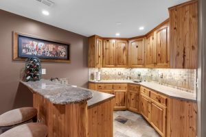 basement offers a warm, cabin-style atmosphere with pine finishes, three additional bedrooms, a full bathroom, a large family room with